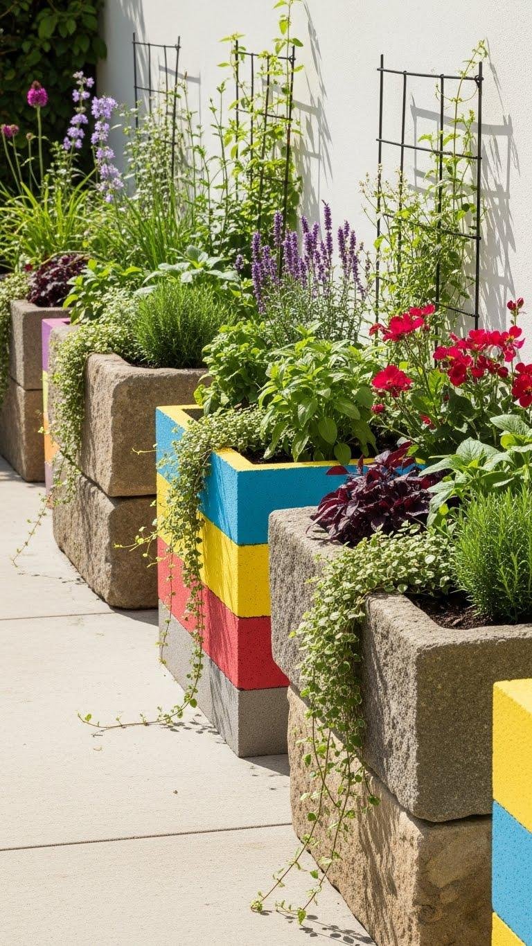 You’ll mix materials like stone troughs and painted cinderblocks for texture and personality, arranging herbs, trailing vines, and bold perennials so you can roam, prune, and harvest with effortless freedom.