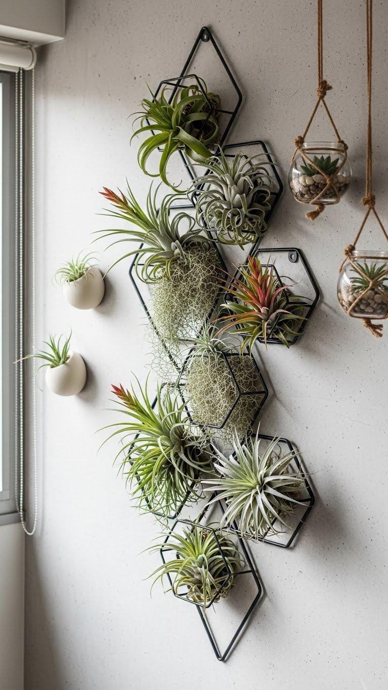 Think of an air plant trellis as a living sculpture you can mount on any wall to bring airy, low-maintenance greenery into tight spaces. You’ll arrange air plant clusters on a geometric frame, mixing metal lines and negative space for a modern vibe.