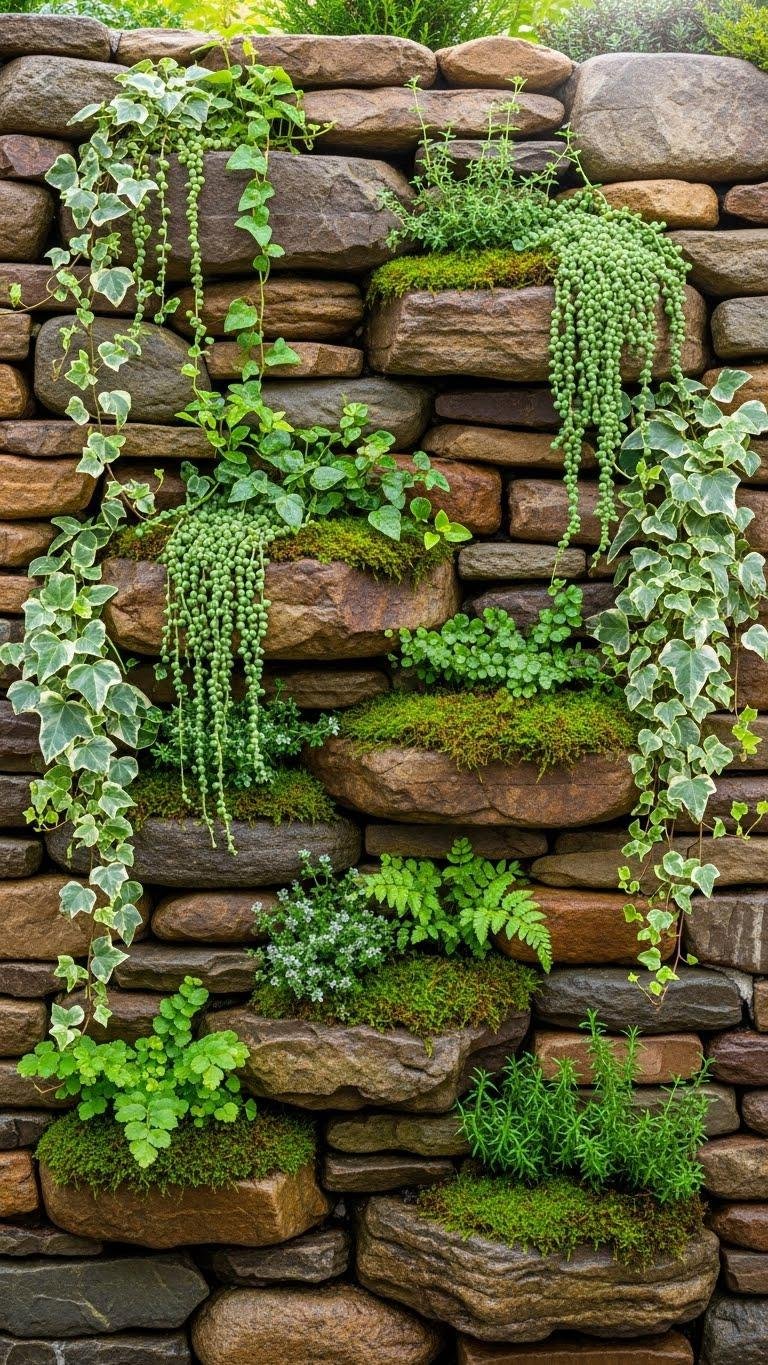You’ll tuck trailing succulents into rocky ledges, train ivy along joints, and create soft moss pockets for ferns and herbs.