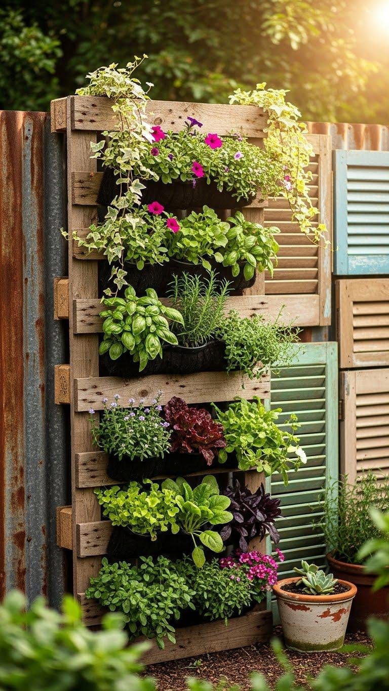 You’ll love mounting a salvaged pallet as a vertical planter or mixing corrugated tin panels with vintage shutters for texture.