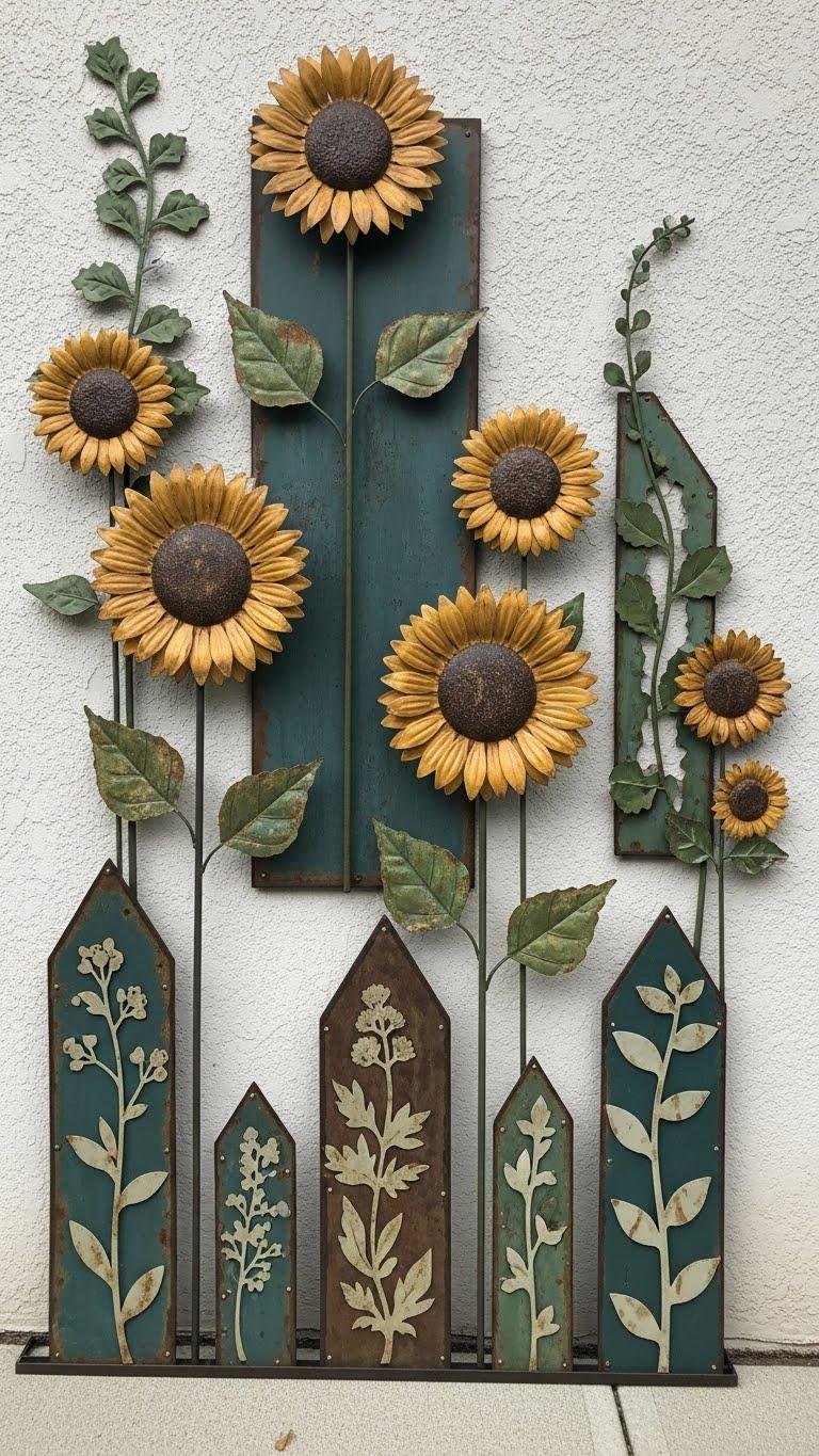 Ever thought about how metal can mimic the warmth of a sunflower field? You’ll love antique sunflower panels and bold botanical silhouettes that catch light and breeze, creating depth on plain walls.