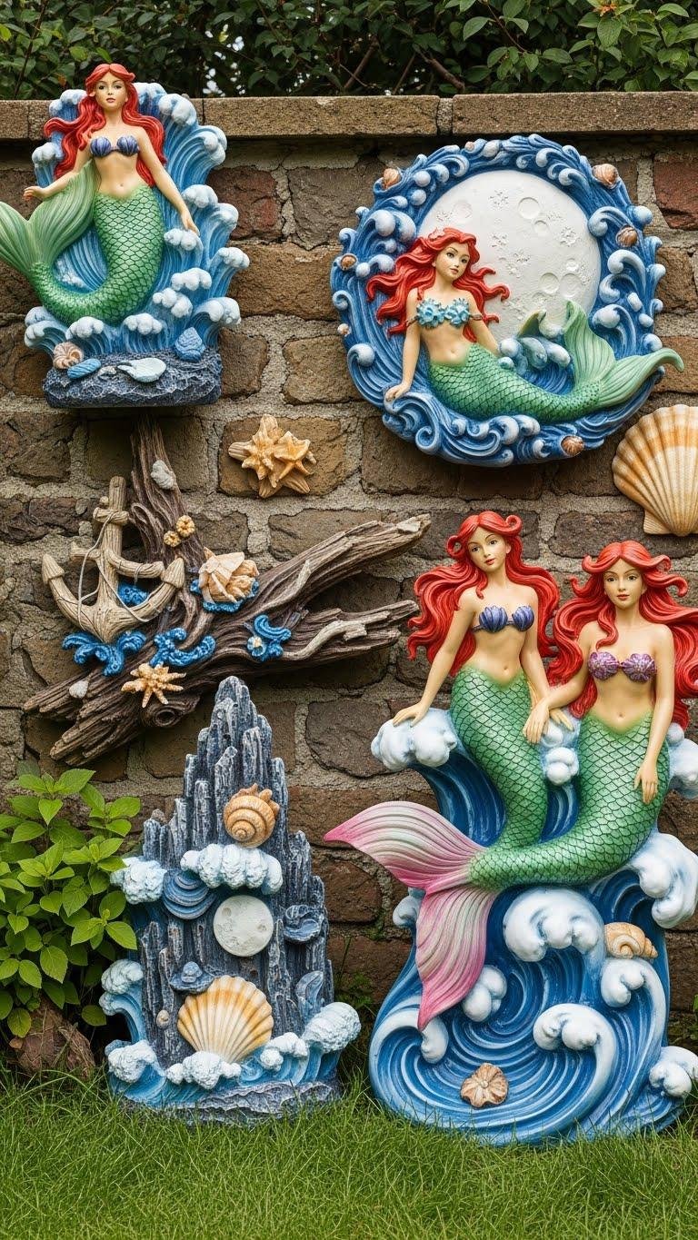If sunflowers and metal silhouettes bring a wild, sculptural energy to a garden wall, mermaid and mythic polyresin sculptures add a touch of storybook enchantment and sea‑worn charm.