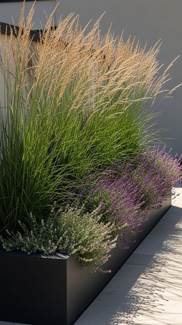 Planting tall grasses and textured perennials in raised planters gives your garden vertical movement and a tactile contrast that reads beautifully against walls and hardscapes.