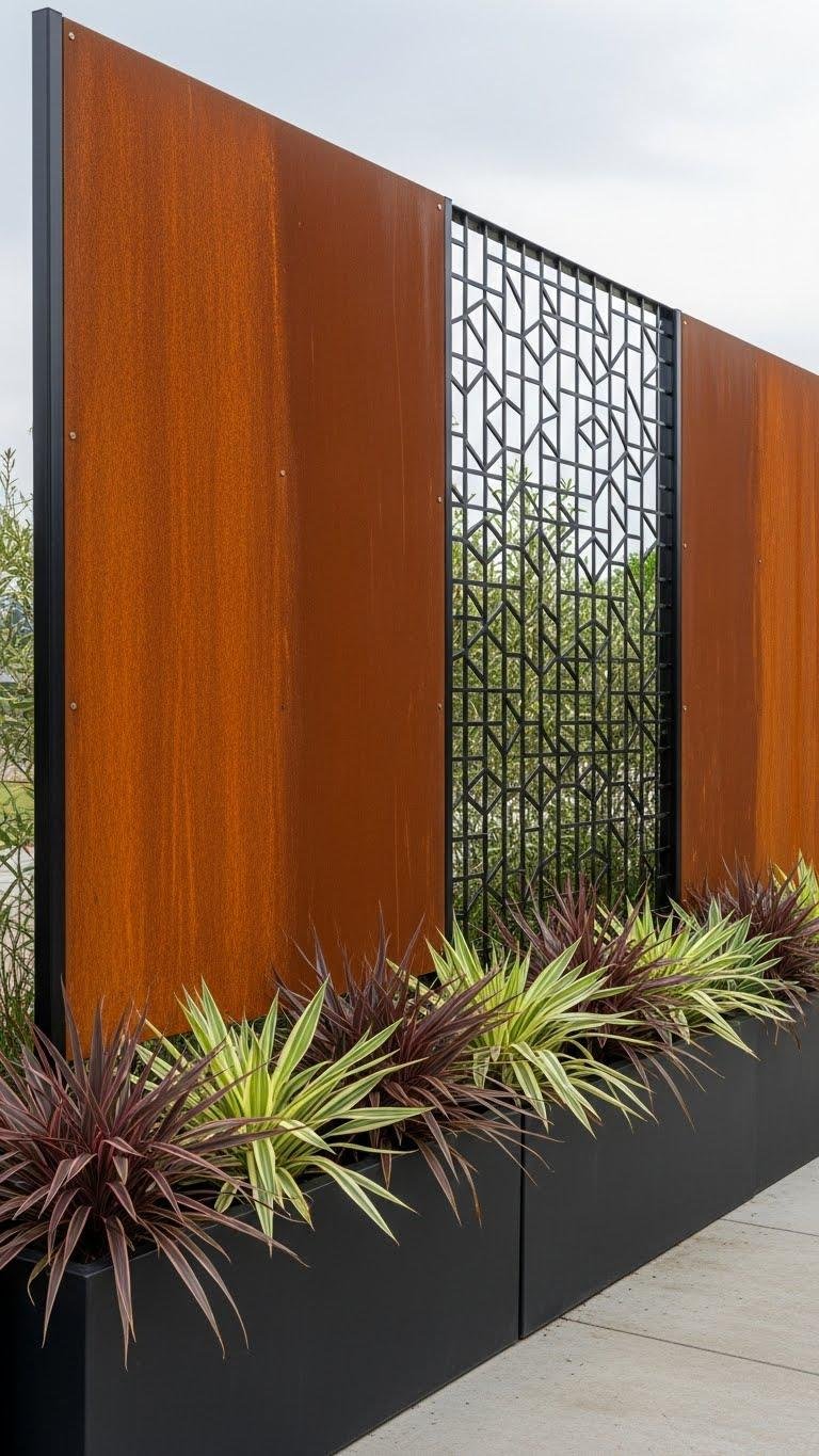 Choose a rustic corten finish or a crisp geometric trellis to add contrast. You’ll plant bold, flowing species below, letting the metal punctuate views, provide privacy, and invite movement and light.