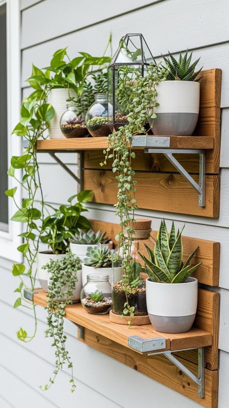 Add an outdoor shelf to your wall and instantly create a layered display that turns plain siding into a living vignette. You’ll mount reclaimed wood with sturdy corner brackets, use weatherproof staining, and arrange ceramic planters for sculptural pops.