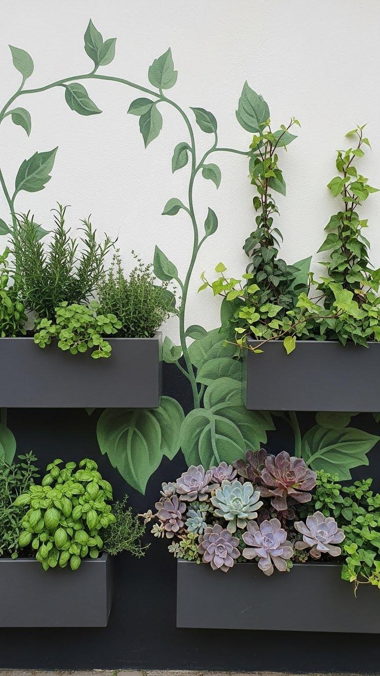 A custom garden mural with integrated planters transforms a flat wall into a living tableau that both decorates and cultivates, letting you combine painted scenes or textured backdrops with pockets, troughs, and modular boxes for real plants.