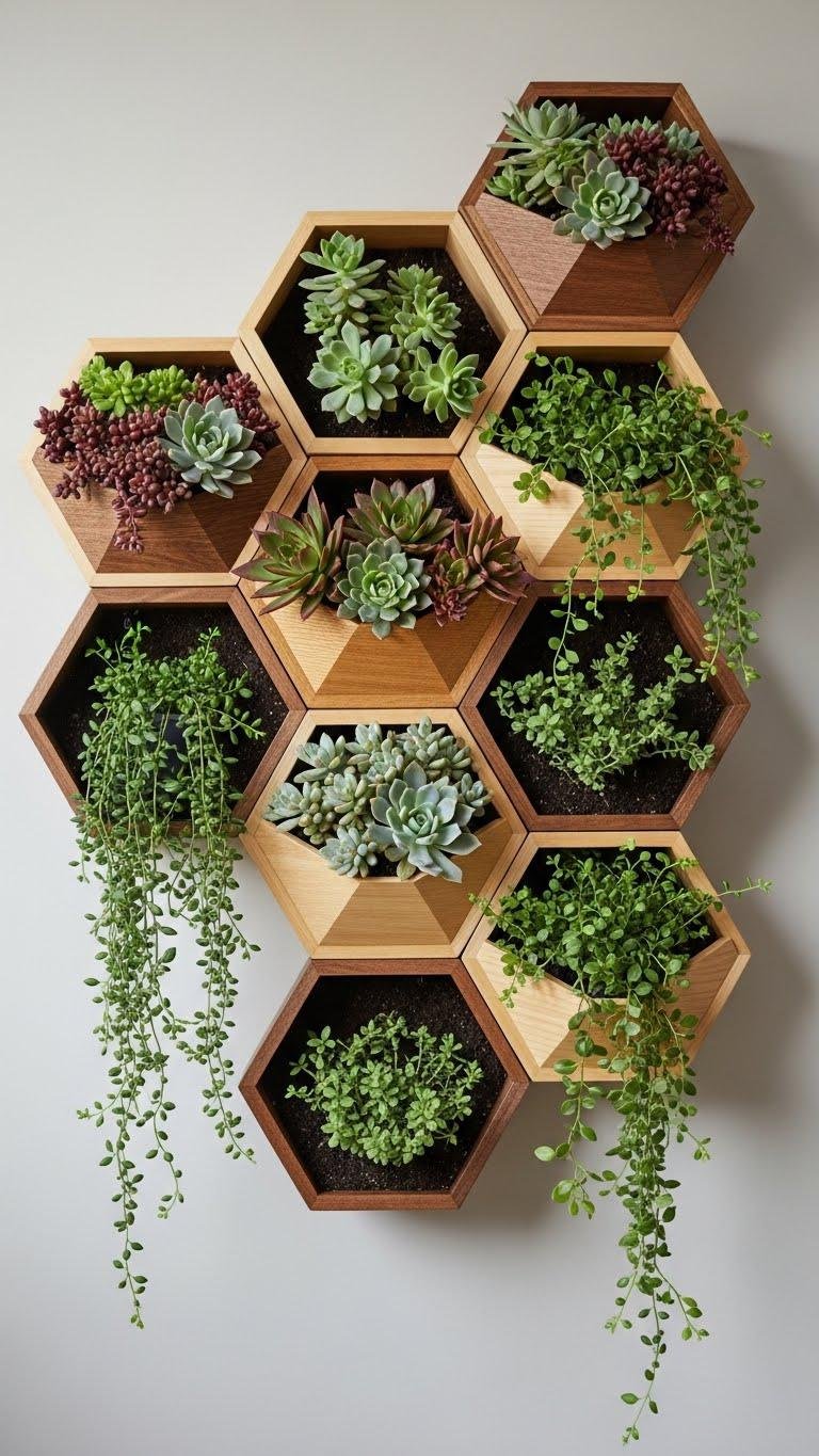 Wood hexagon planters make a striking focal point, but pocket planters let you cover an entire wall in living texture and movement.