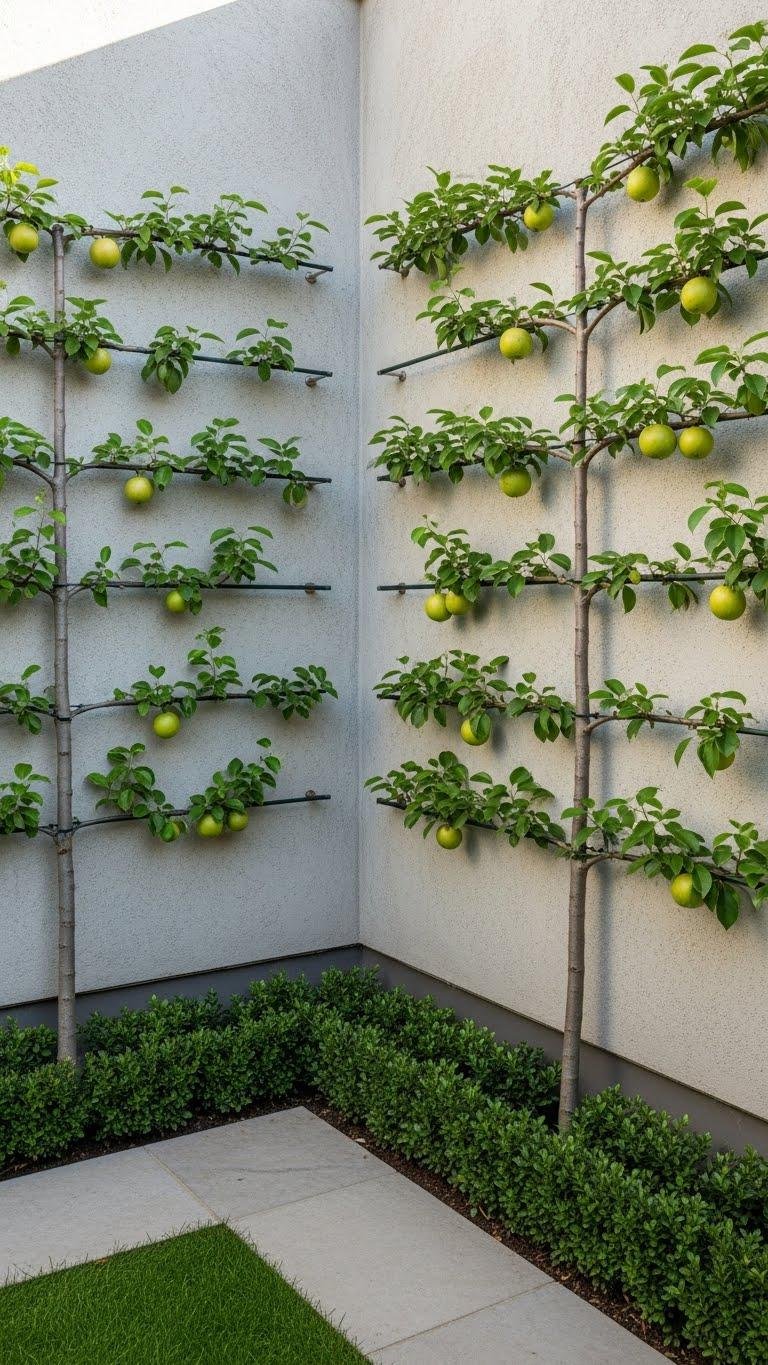Train espaliered fruit trees against a wall to turn vertical space into a productive, sculpted feature that’s both decorative and practical. You’ll shape branches with careful espalier training, securing limbs to horizontal supports for crisp, architectural lines.