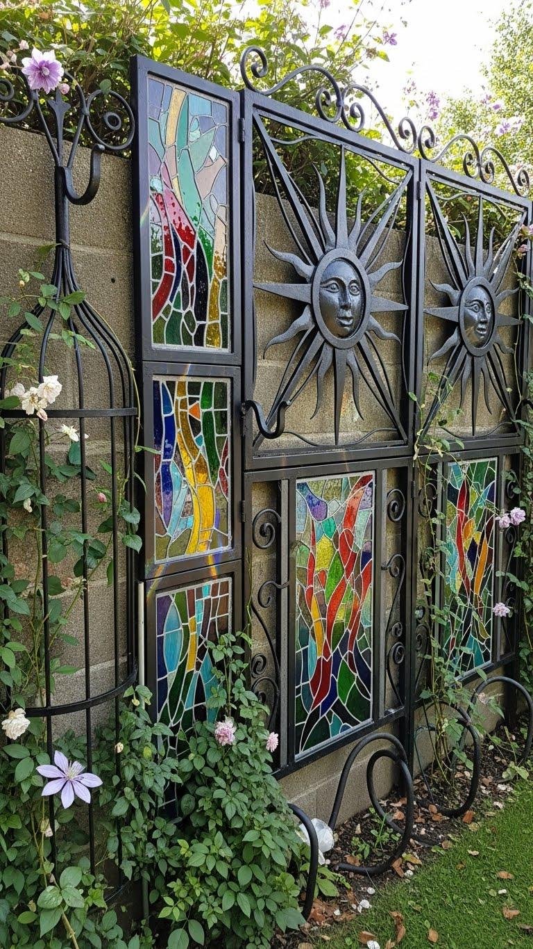 Add decorative metalwork and mosaic tiles to give your garden wall instant character and texture. You’ll pair bold wrought iron panels with colorful stained glass mosaics to catch light and breeze.