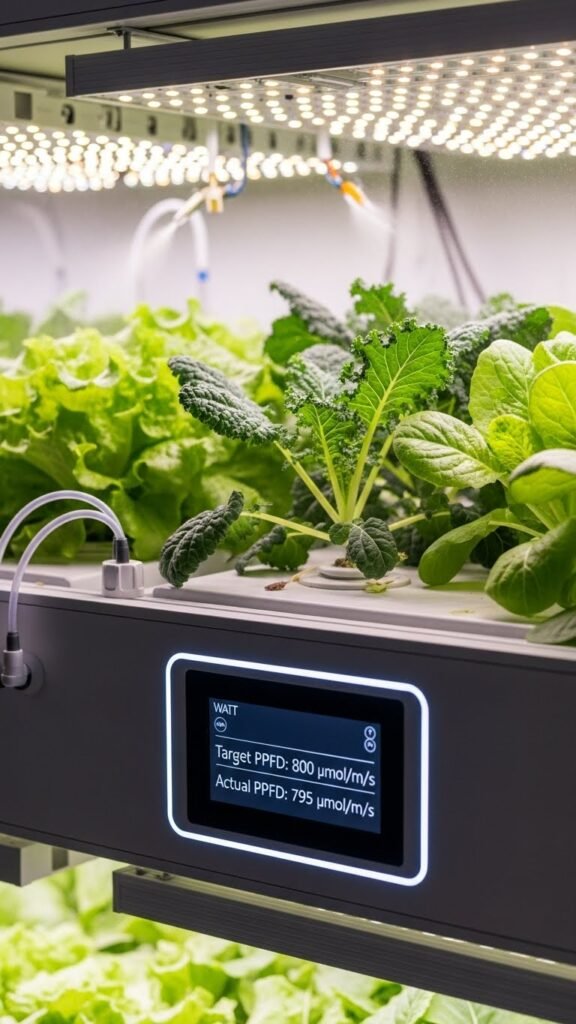 Focusing on PPFD (photosynthetic photon flux density) rather than wattage gives you a direct, measurable target for the light plants actually use, because PPFD quantifies the number of PAR photons (µmol·m⁻²·s⁻¹) hitting the canopy rather than the electrical power a fixture consumes. Set a realistic target PPFD per species, measure with a calibrated meter, and optimize sensor placement to map uniformity and avoid wasted energy.