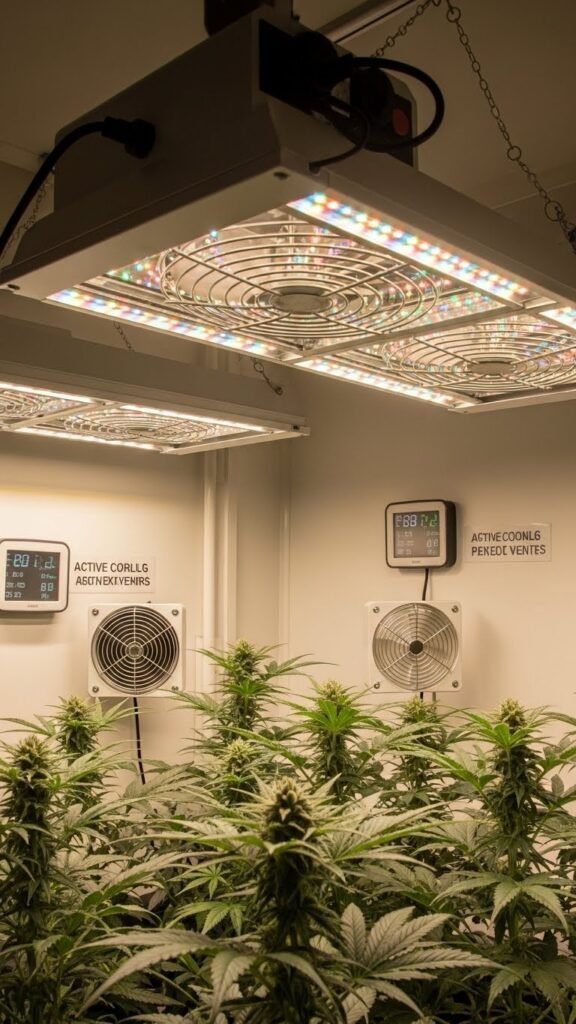 Use active cooling (fans, inline extractors) and passive vents, monitor canopy temps, and design airflow management to remove radiant heat. That preserves photosynthesis, prevents stress, and keeps you free to optimize light placement.