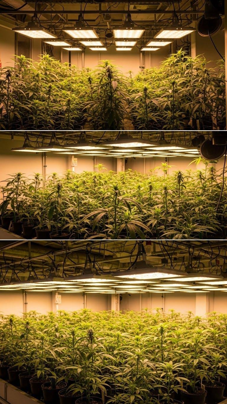 Once you’ve mapped canopy PPFD and eliminated hotspots, distribute light with several lower‑intensity fixtures rather than relying on a few powerful sources. You’ll achieve uniform PAR, reduce shadowing, and lower heat.