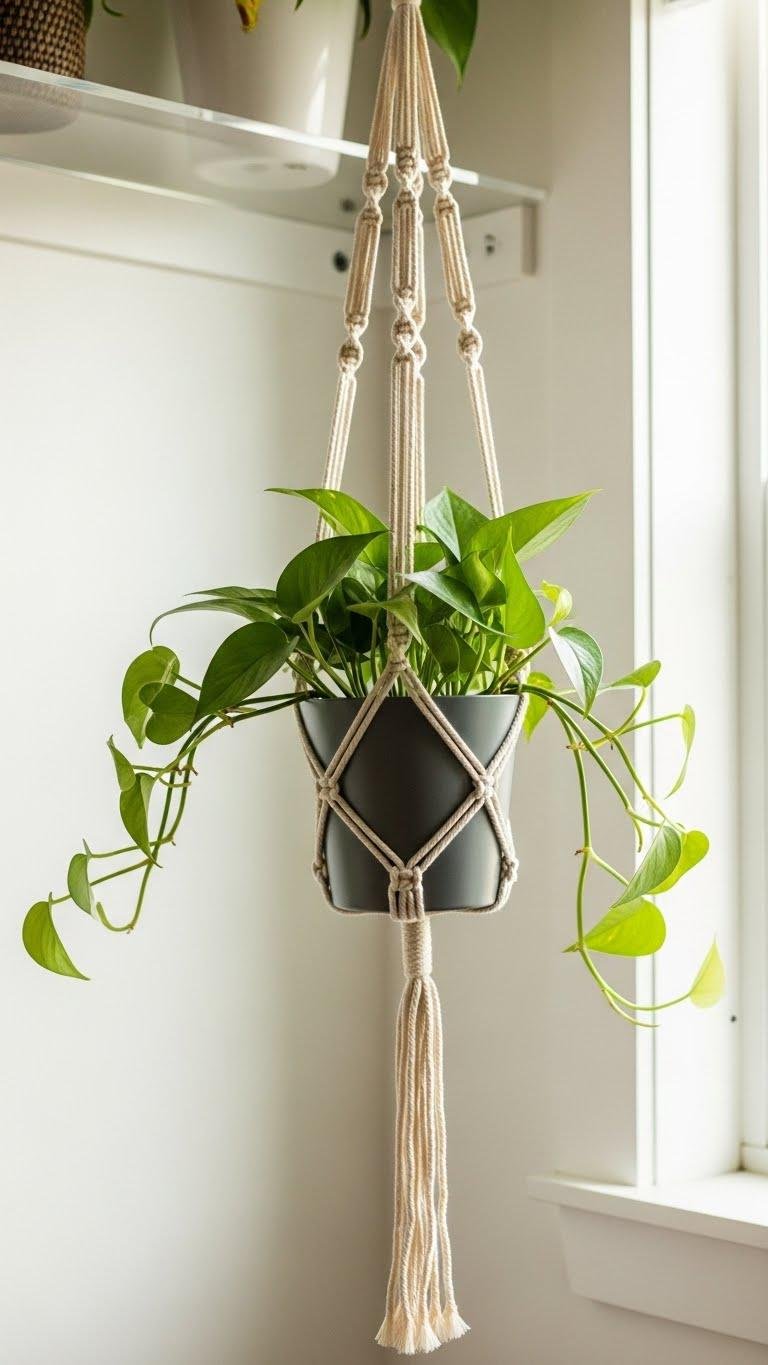 Knot a simple macramé single-plant hanger and you’ll add instant vertical interest while keeping a shelf or windowsill clear.