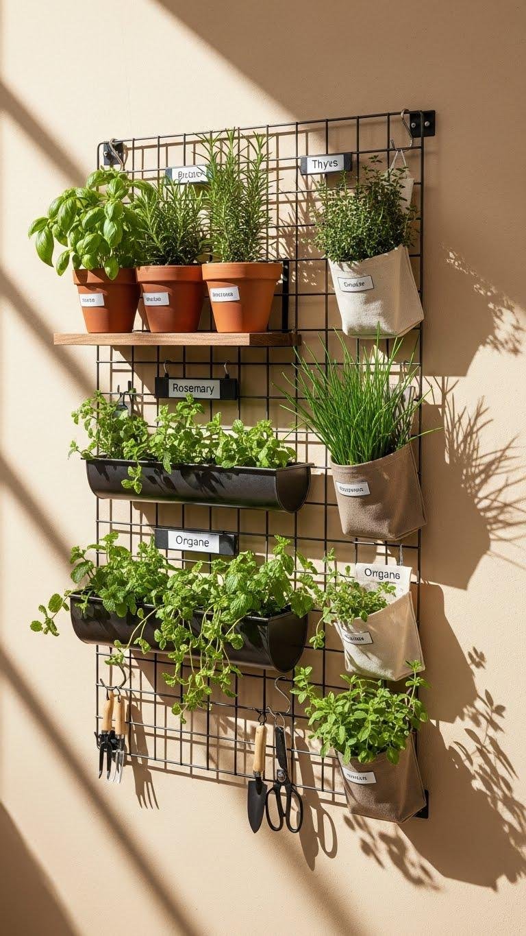 Move from the rustic charm of a basket vine to a clean, organized herb display by mounting a grid panel on a sunny wall—this gives you a modular, space-saving system for pots, planters, and hanging bags.