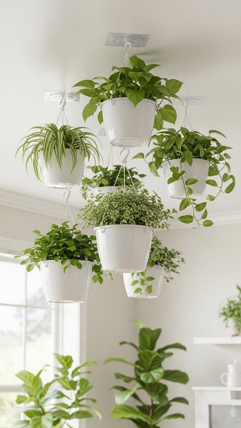 Perched overhead on clear adhesive pads, hanging pots turn unused ceiling space into an elegant, hands-free garden you can tweak without a drill. You’ll choose lightweight vessels, check weight limits, and test adhesive surfaces for damage prevention.