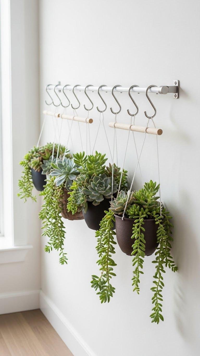 If you liked the hands-free look of adhesive ceiling pots but want something modular and more forgiving of heavier plants, an S-hook hanging succulent rail gives you that freedom with minimal fuss.