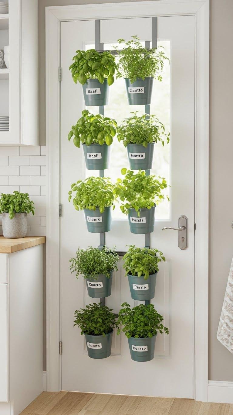 While you’re short on counter space, an over-door herb basket organizer turns unused vertical real estate into an efficient, airy kitchen garden you can reach in seconds.