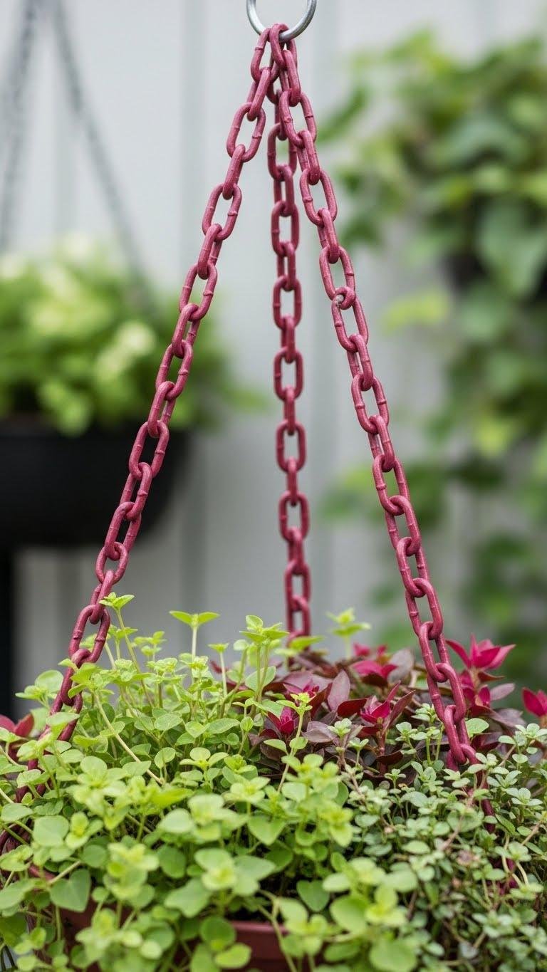 Give your plants a bold, industrial-chic lift by painting their hanging chains to match your decor: choose rust-resistant metal links, sand and prime them, then spray or brush on durable outdoor paint for a seamless, weatherproof finish.