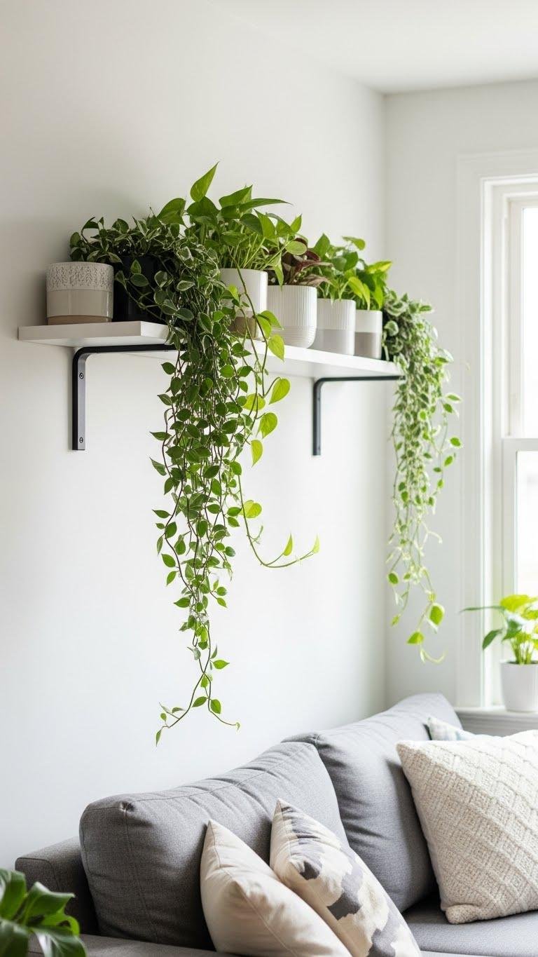 Perched near a sunny window or mounted above a couch, a floating shelf with trailing plants turns unused wall space into a living artwork you can tailor to your light and style.