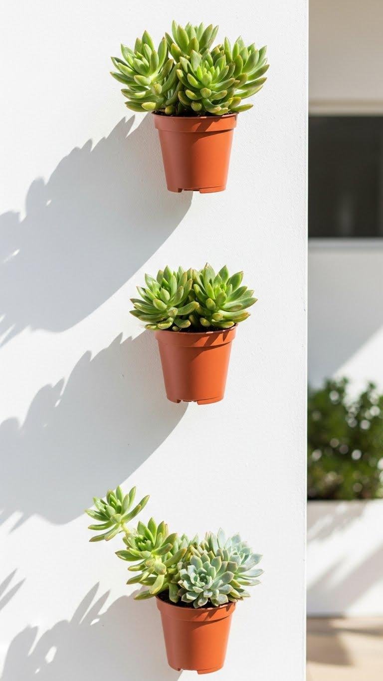 Stick three small pots to a sunny wall and you’ve got an instant vertical succulent display that’s both sleek and low-maintenance.