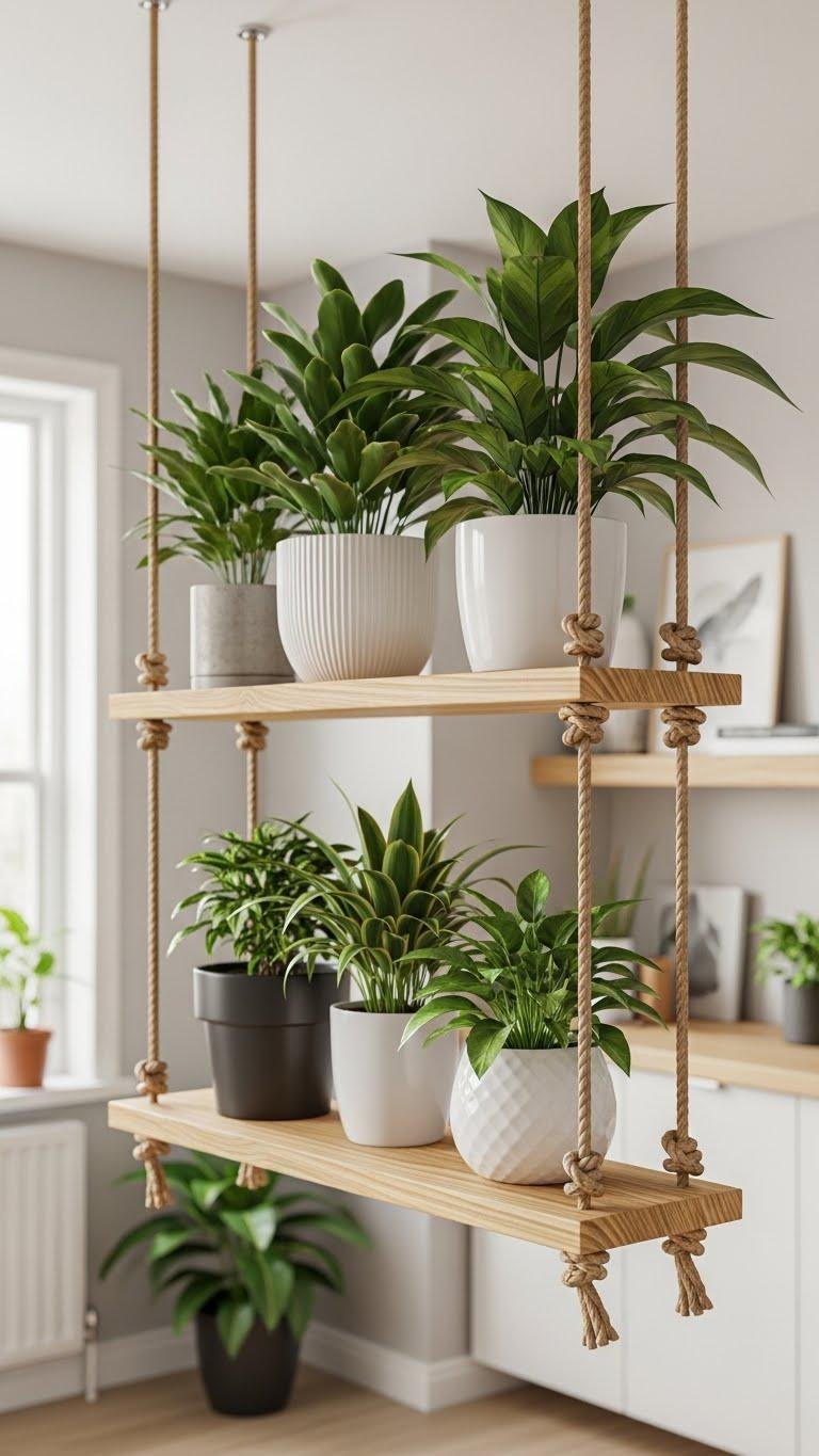Hang a simple plank from sturdy rope and you’ll create a chic, space-saving shelf that puts your plants on display without cluttering floors or windowsills.