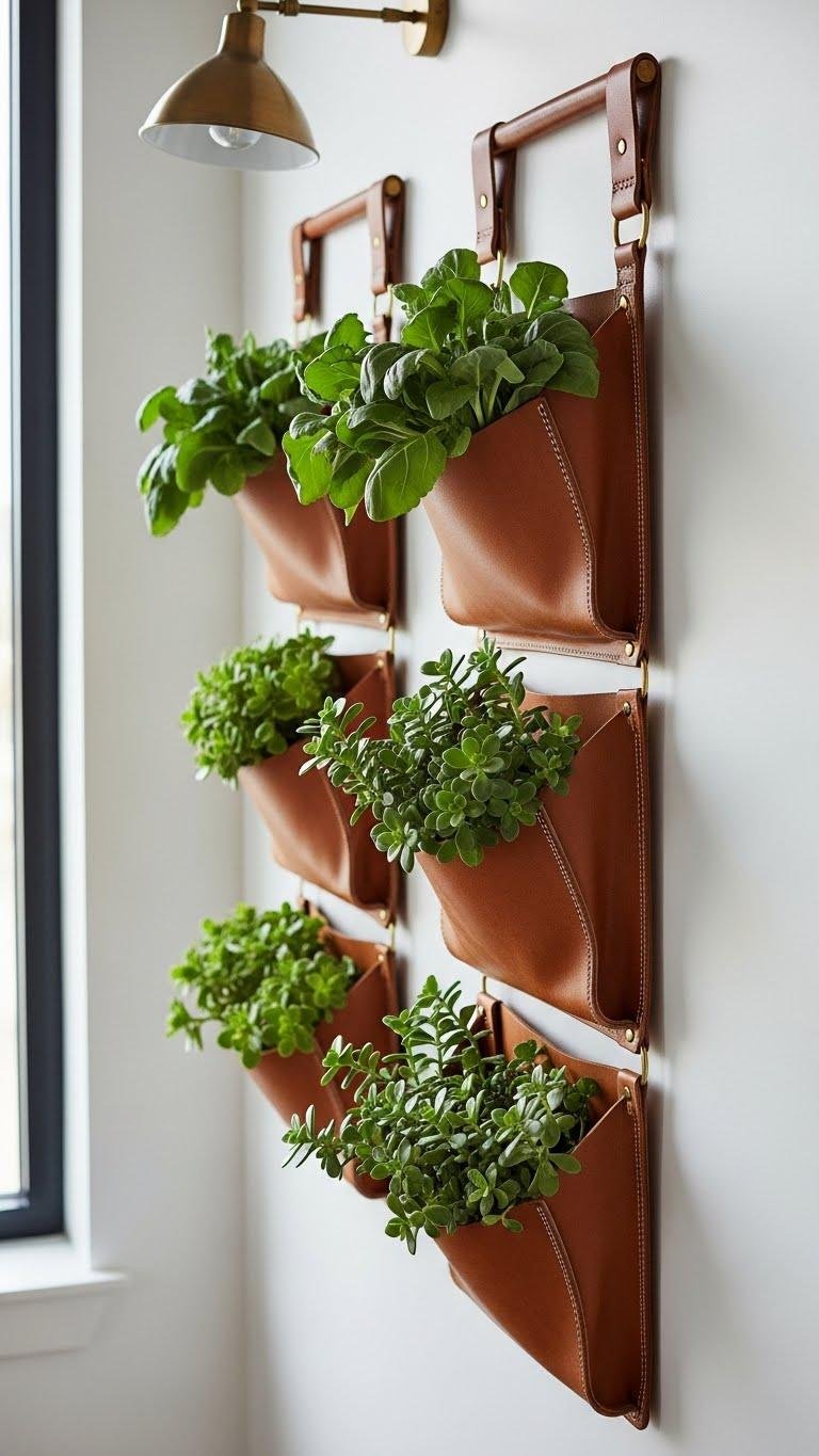Create a sleek, vertical garden by mounting leather strap wall planters that blend warmth and structure into any room. You’ll cut sturdy straps, attach pockets sized for succulents or vegetable pockets, and secure with brass hardware.