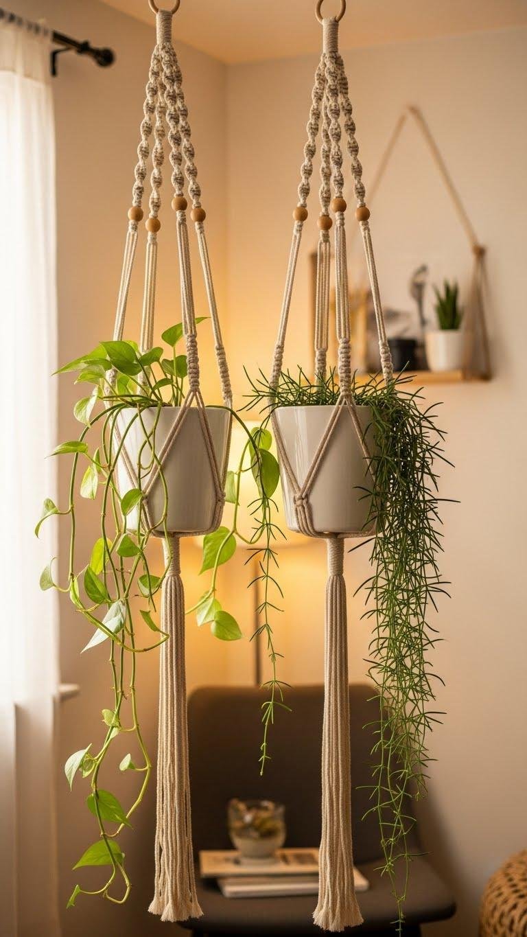 You’ll craft two staggered holders with knotted beads for grip and rhythm, freeing trailing plants and enabling indoor propagation stations.