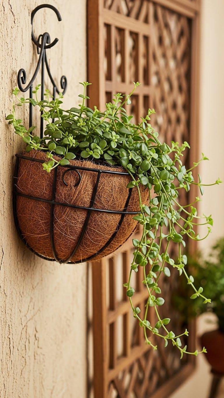 Think of an heirloom basket repurposed as a vertical vine stage — you’ll mount it flush to the wall, nest a compact trailing plant inside a coconut liner or small pot, and train stems to spill and climb across a nearby trellis or hook.