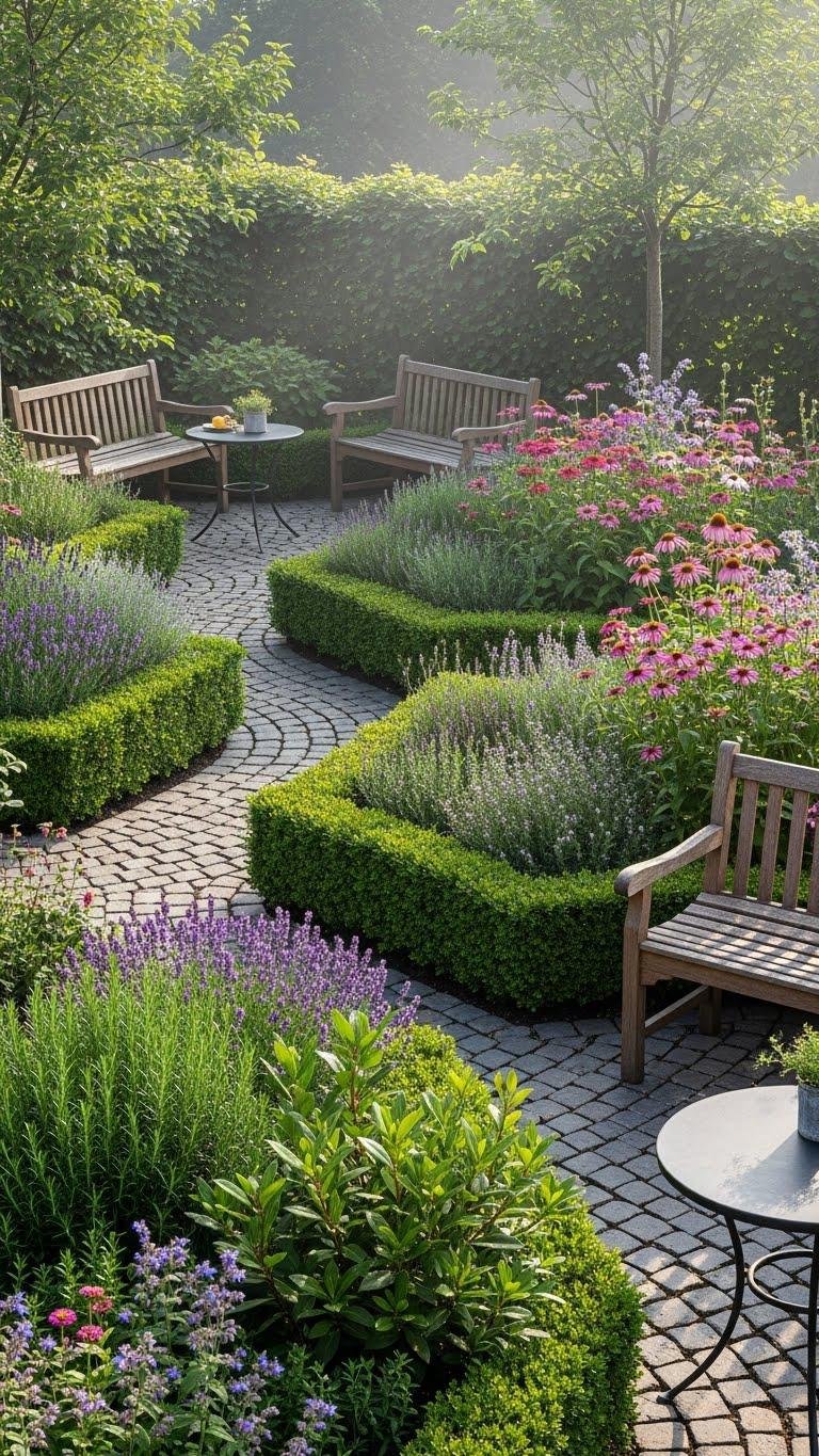 Use scented steppingstones to boost aroma underfoot, add lavender edging for structure, and choose hardy varieties for low-maintenance freedom.