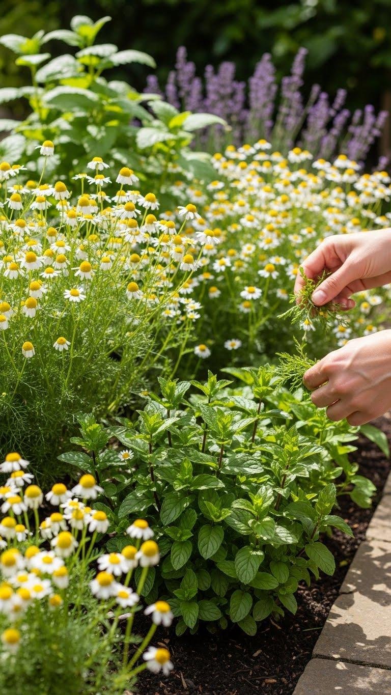 You’ll plant chamomile in sun, peppermint where it can spread, and use aromatic companion planting like lemon balm or lavender.