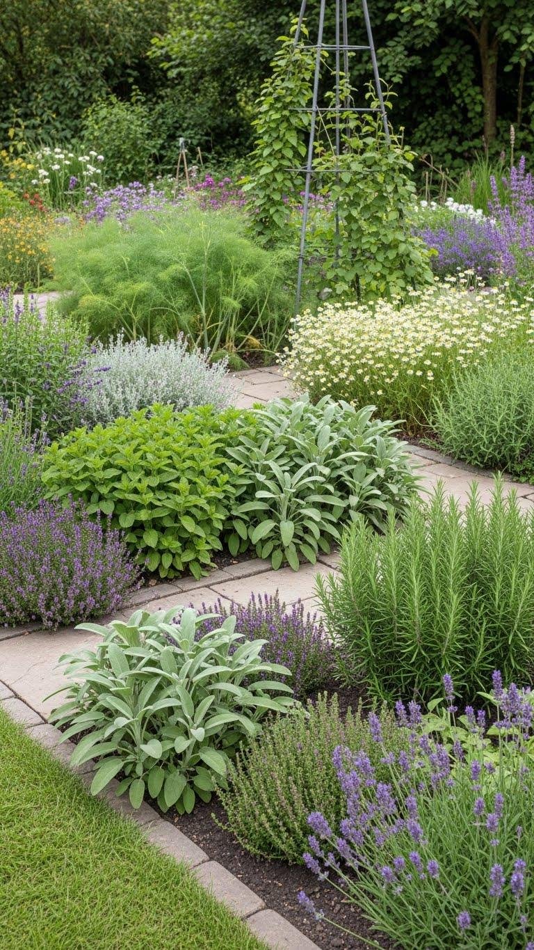Use sage as a savory, medicinal companion while lavender adds floral calm and pollinator appeal. You’ll enjoy fresh herbs for cooking and a relaxed, free outdoor nook.