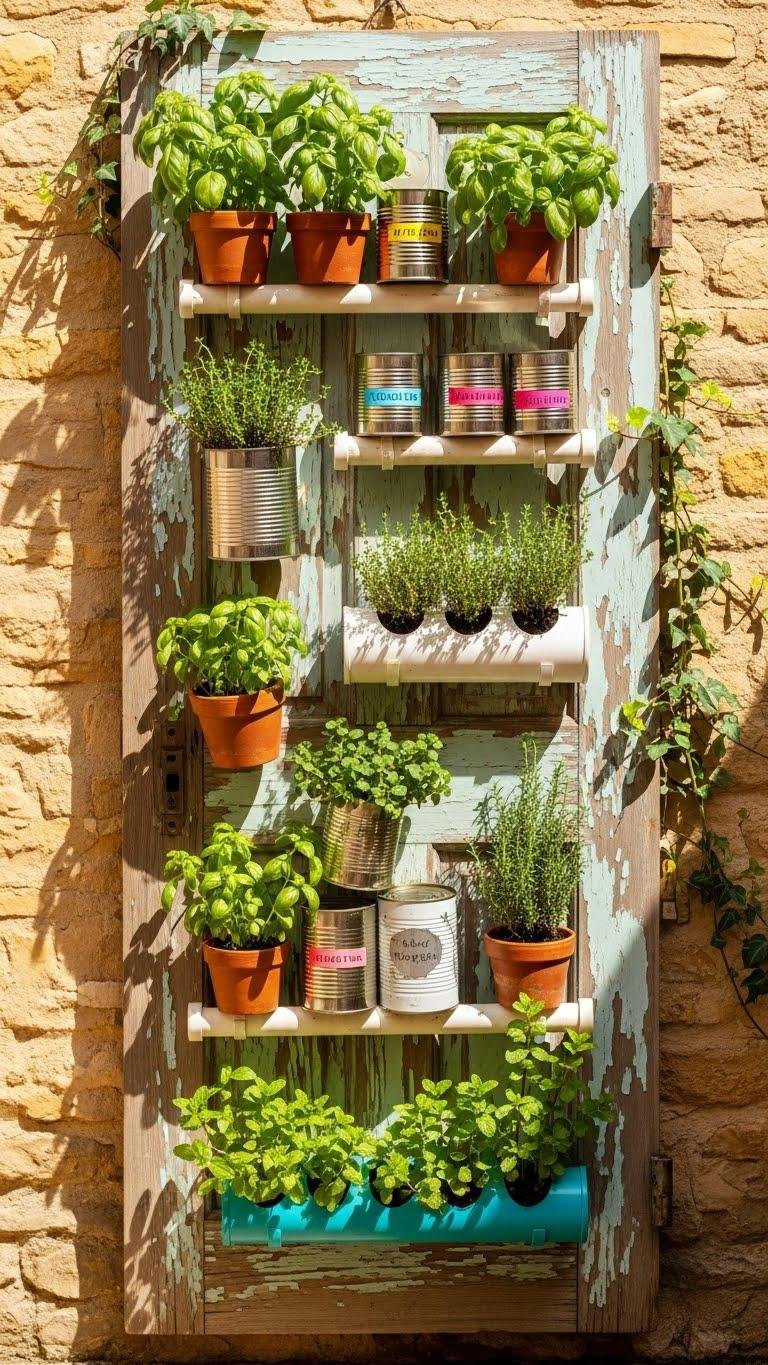 If you’ve got an old door gathering dust, turn it into a striking vertical herb garden you’ll actually use—mount it against a sunny wall or fence, attach planters or repurposed containers to the panels, and grow a mix of basil, thyme, and mint for easy snipping.