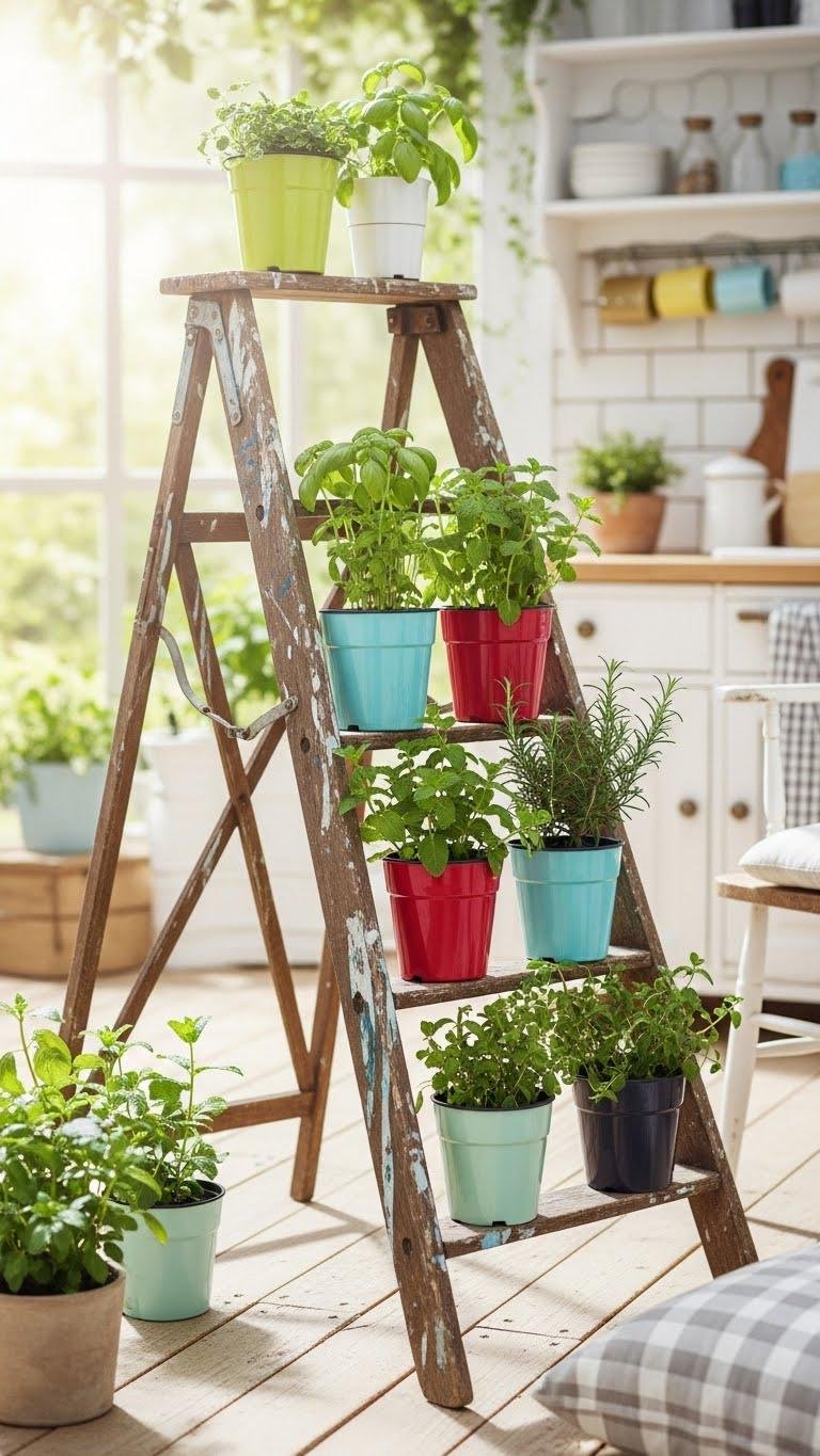 Lean a simple cedar ladder against a sunlit wall and you’ve got an instant vertical herb gallery that’s both rustic and refined.