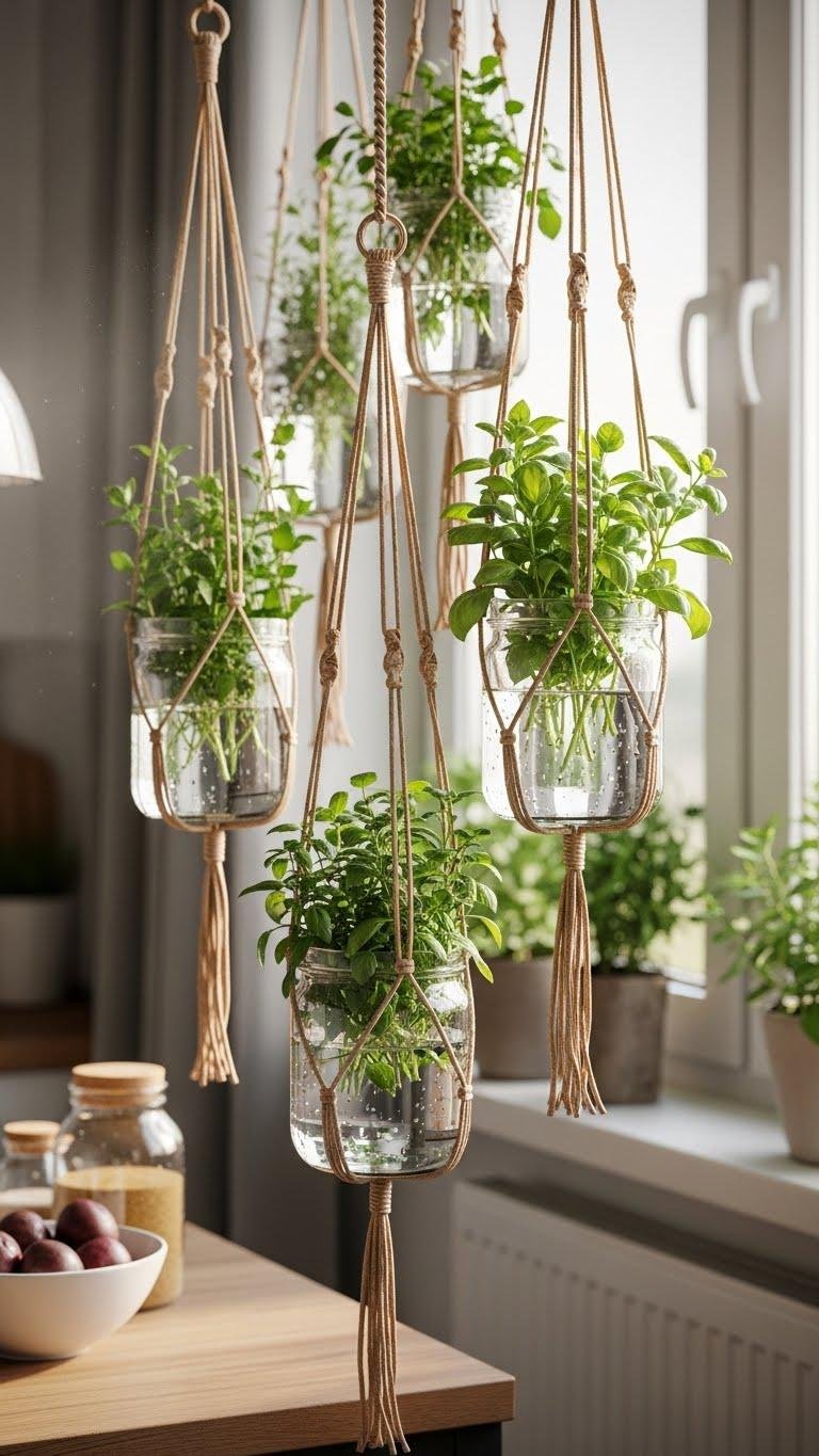 You’ll suspend jars with sturdy rope or macramé, ensuring proper air circulation and smart light placement so herbs thrive. Anchor to studs, rotate jars for even growth, and water from above. It’s freeing, minimal, and utterly practical.