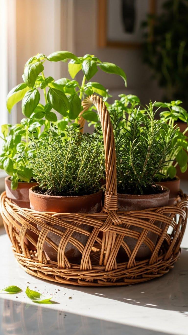 A woven wicker basket makes a charming, space-smart centerpiece for a countertop herb cluster, and you can arrange several small pots inside to create an instant mini-garden that’s both decorative and useful.