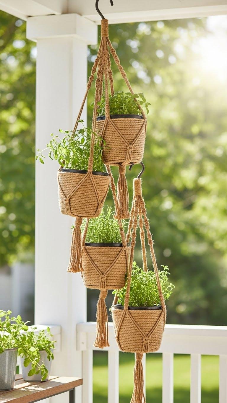 With natural rope coiling around three staggered pots, your herbs get a boho-chic display that’s easy to hang anywhere — porch, kitchen, or balcony.