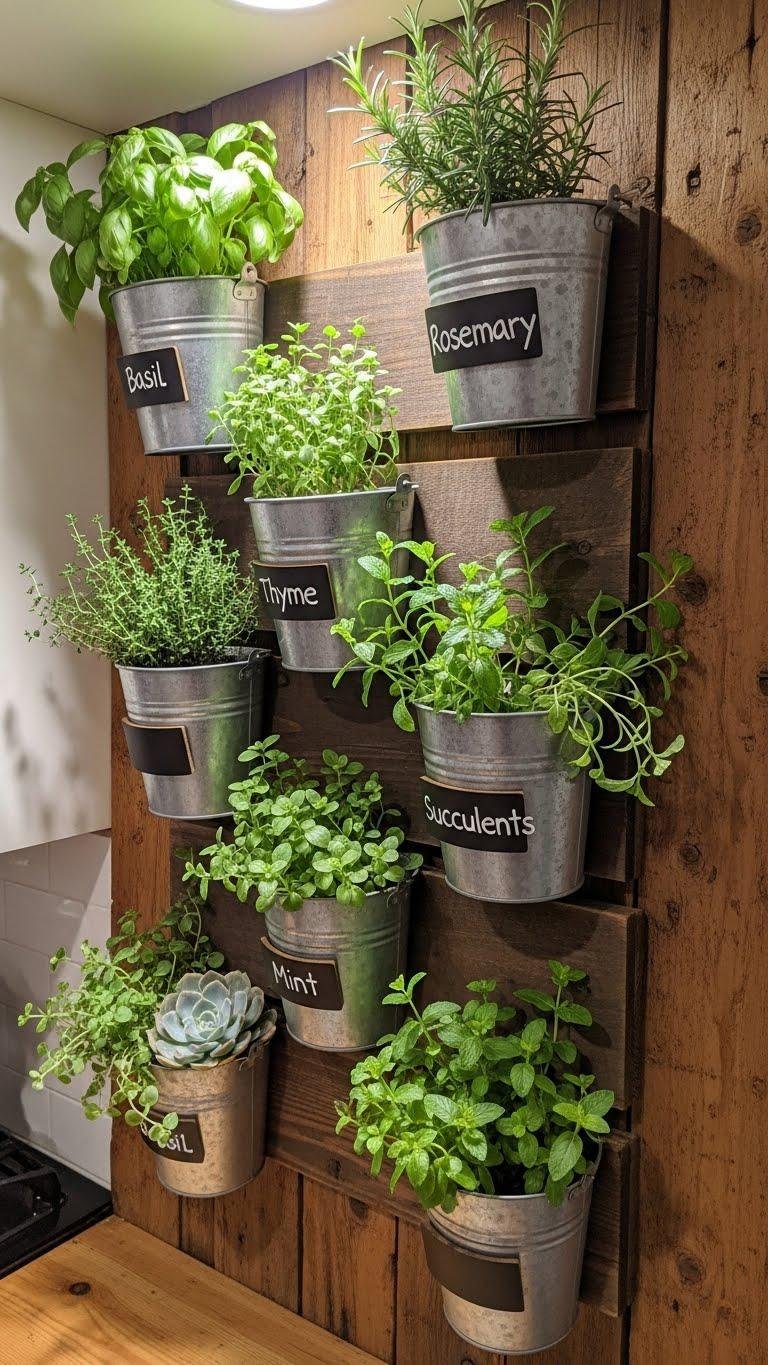 Mount buckets at varied heights, add well-draining soil, and mix herbs with a succulent pairing for texture. Finish with rustic signage to label plants and keep your kitchen feeling free and curated.