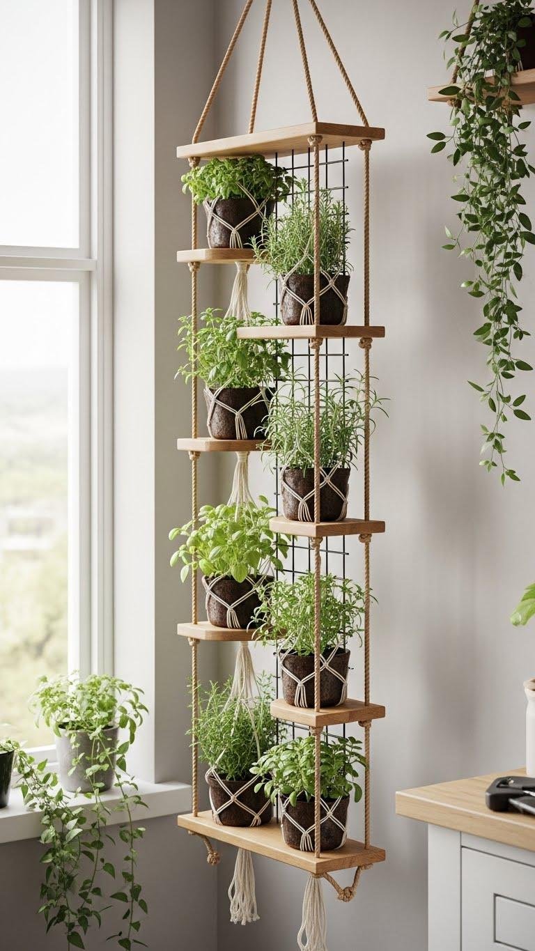 Hang a cascading herb tower to bring vertical greenery and a boho vibe into a small kitchen or balcony.