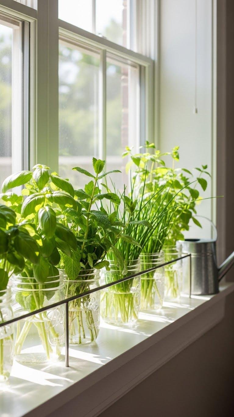 Perched along a sunny sill, a row of mason jars turns leftover glass into an effortless, chic herb station you’ll actually use.