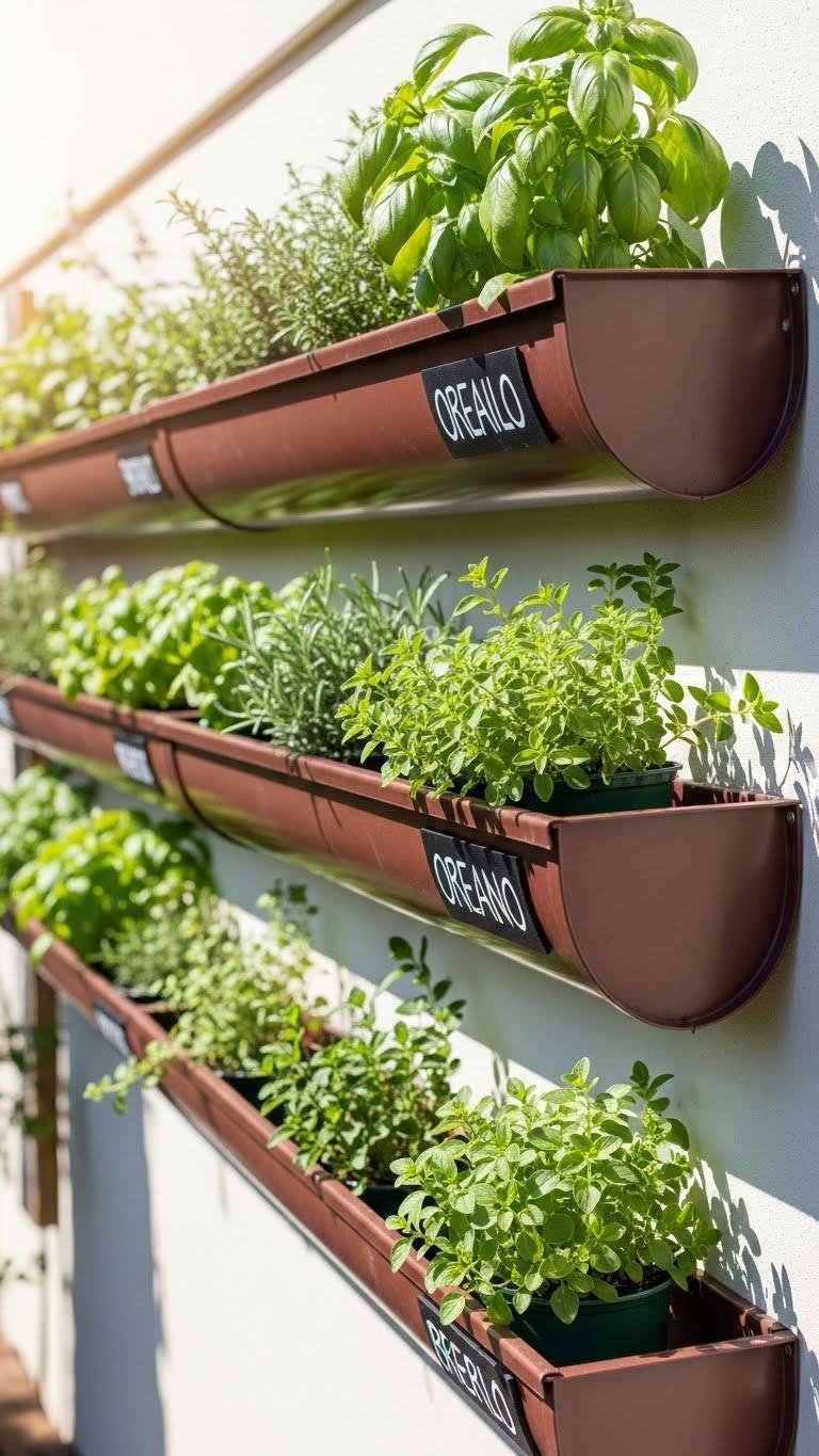 Mount a row of recycled rain gutters on a sunny wall and you’ve got a sleek, space-saving herb garden that’s as practical as it’s trendy. You’ll screw brackets, add drainage, and label each spot with chalkboard labels for easy chalkboard maintenance.