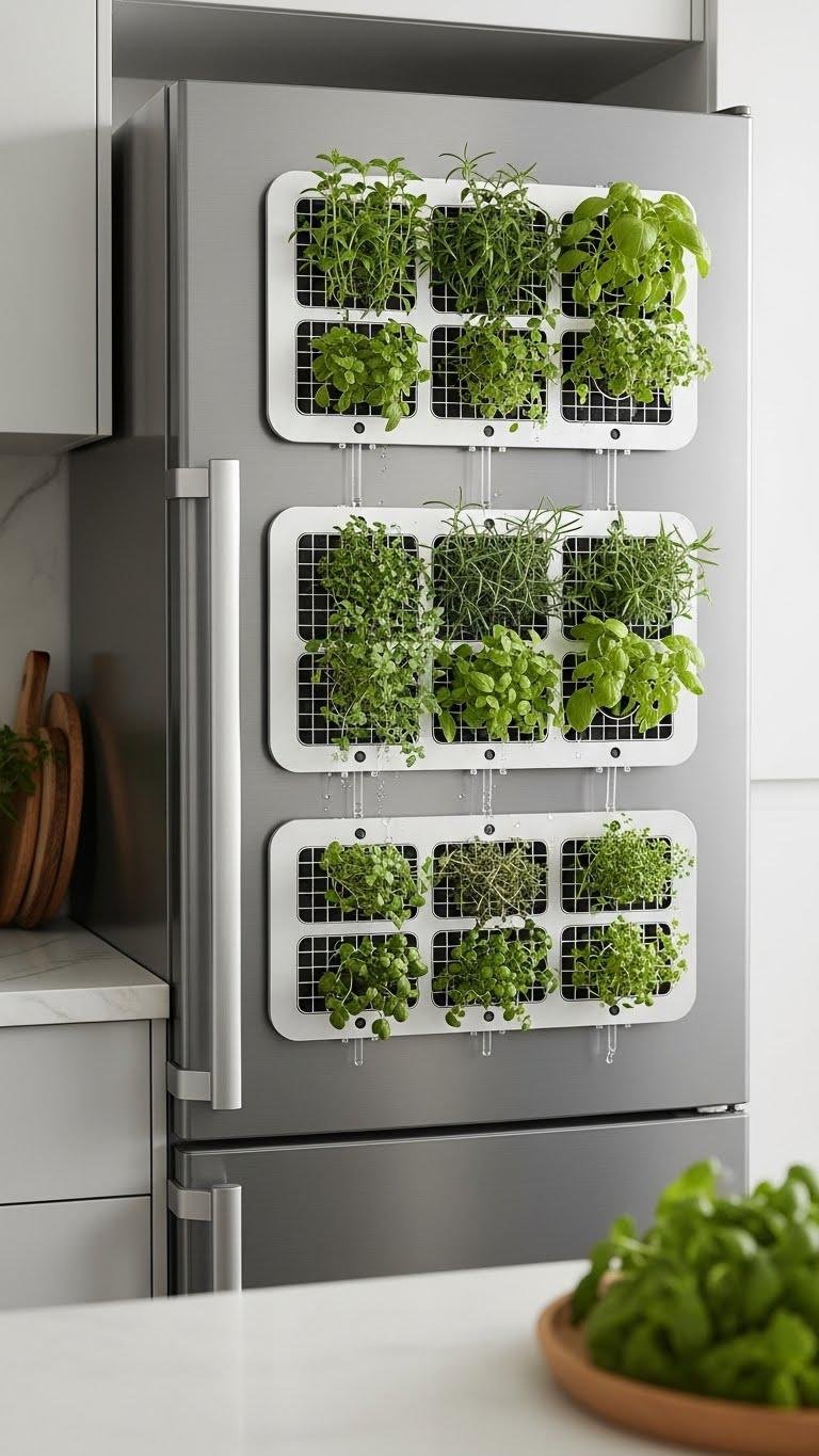 Stick modular magnetized herb grids to your metal fridge and turn wasted vertical space into a tidy, accessible mini-garden that keeps fresh herbs within arm’s reach.