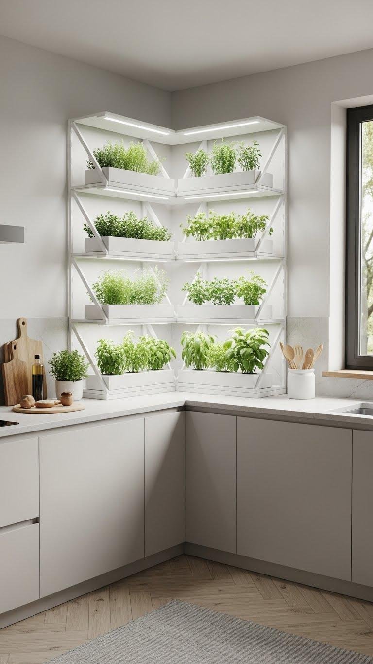 Corner-cornered vertical hydro shelves tuck into unused kitchen angles and give you a lot of growing power without taking up floor space. You’ll mount slim racks with space efficient tiers, angled cornerplant supports and LED strips to maximize light.