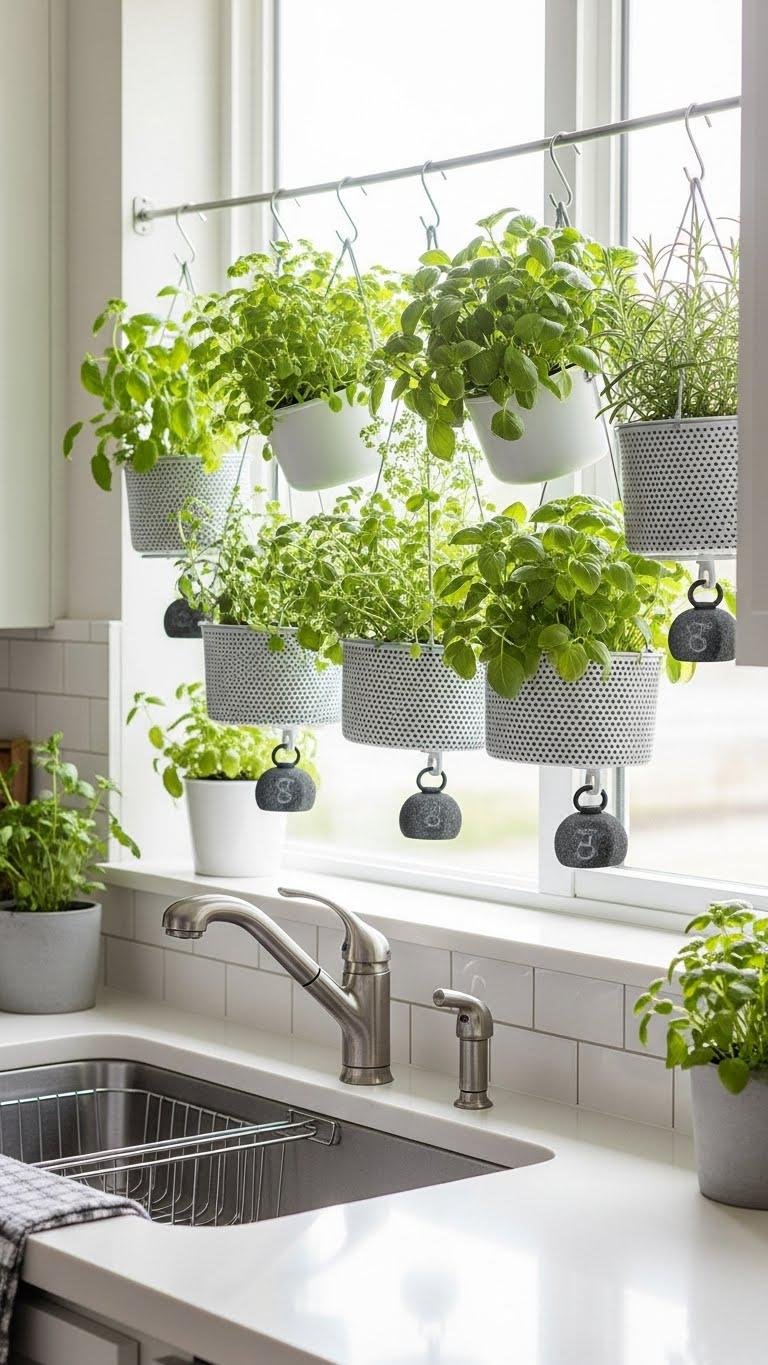 Hang a cluster of hydroponic baskets above your sink to turn wasted vertical space into an efficient, eye-catching herb station that’s easy to access while you cook or wash up.