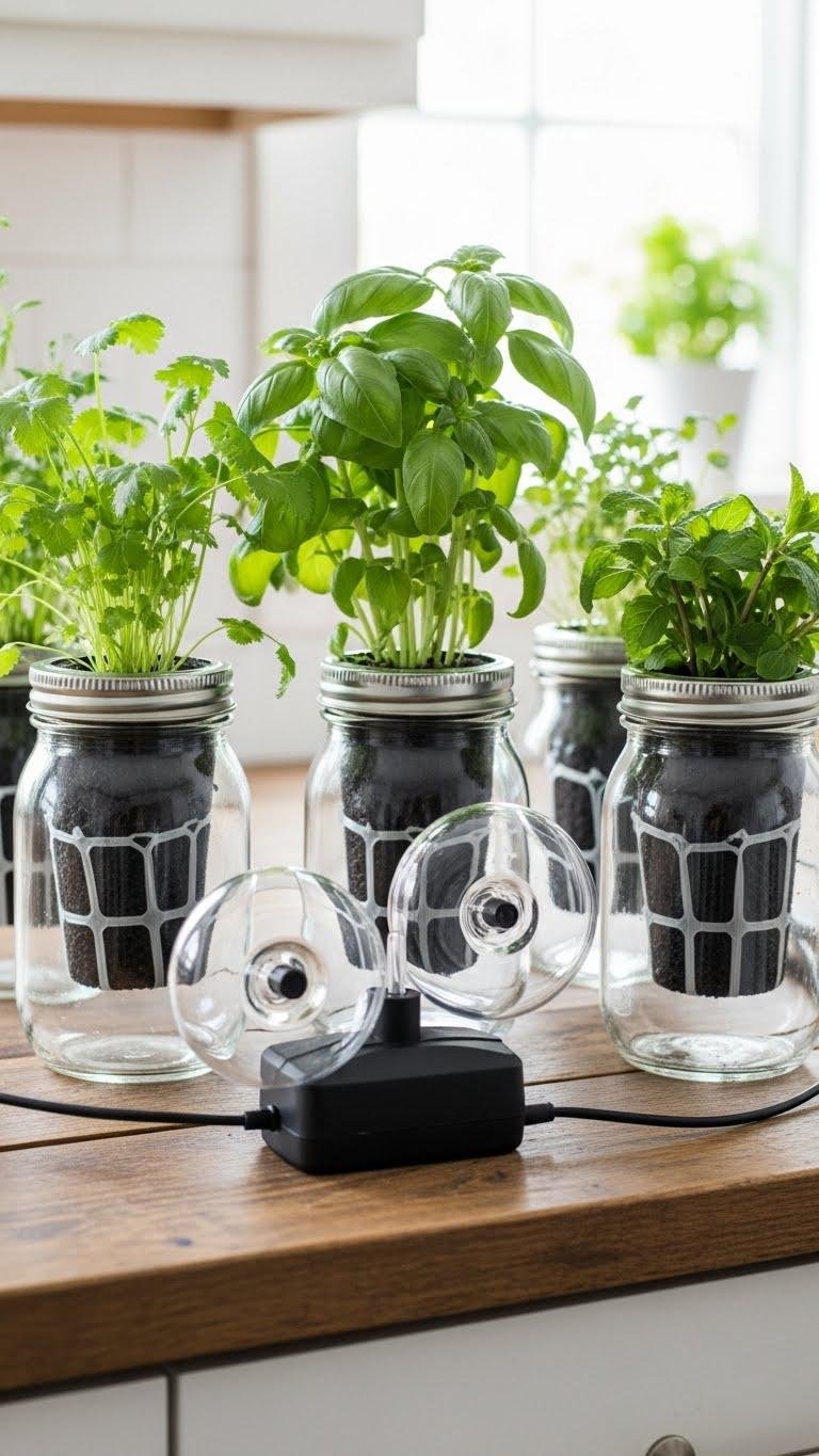 Bring a bit of modern farmhouse charm to your kitchen with DIY Mason-jar bubbler herb stations that keep herbs aerated, visible, and within arm’s reach.