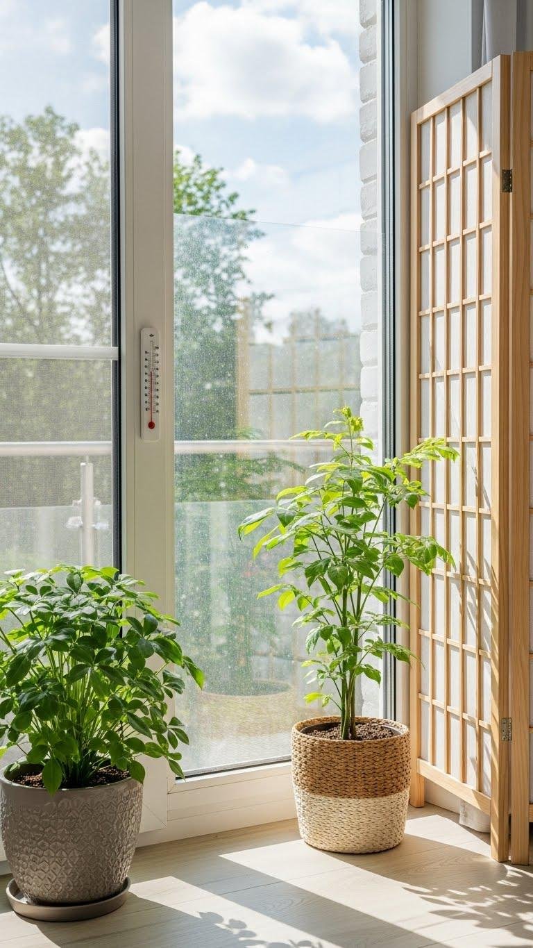 During hot afternoons, shield your plants from overheating window glass by creating a buffer that cuts glare and heat without blocking all light. Move pots back a foot, add sheer curtains or reflective window film, or use a light wooden screen.