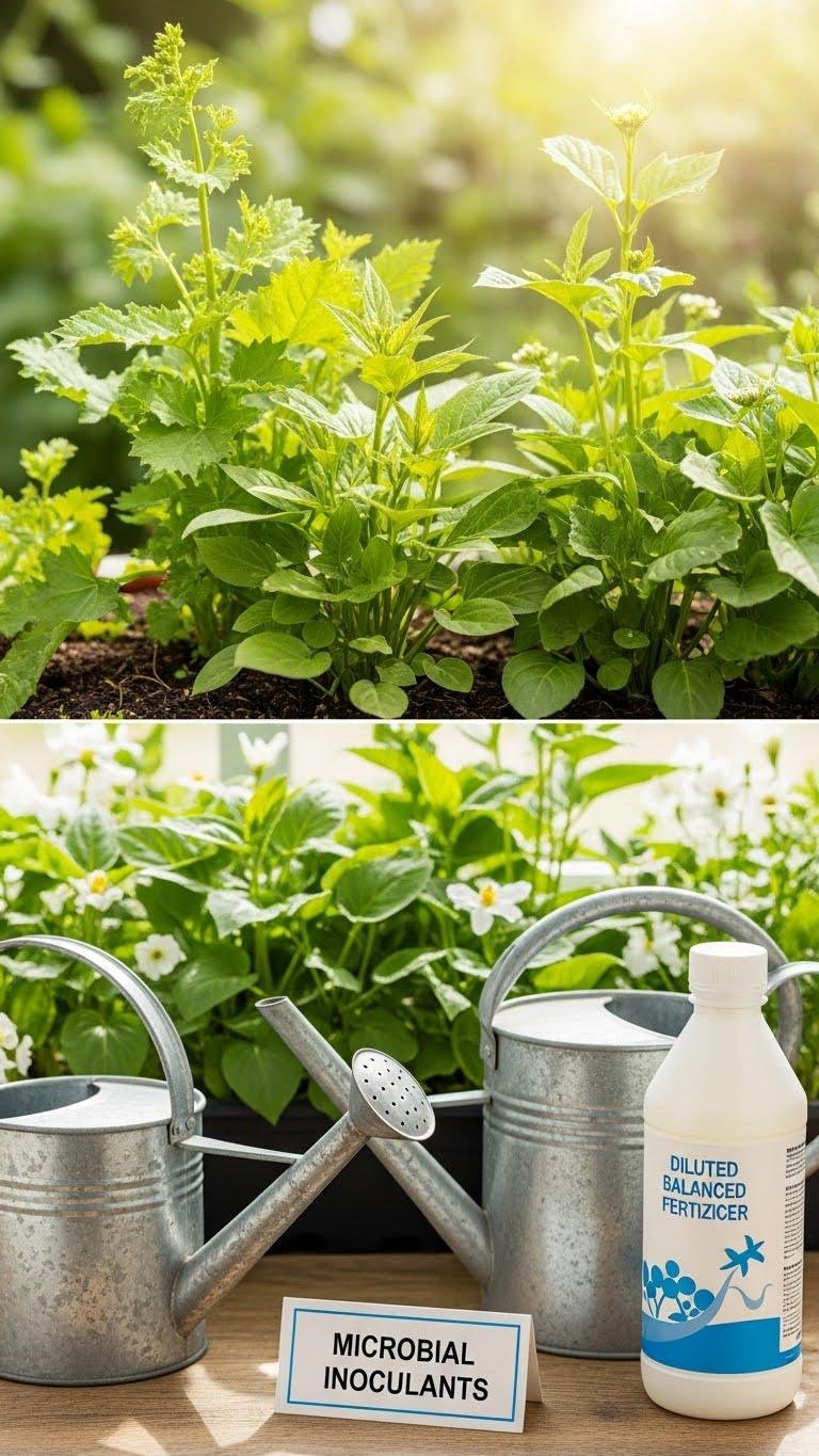 Use a balanced, diluted fertilizer every 2–4 weeks and consider microbial inoculants to boost soil life.