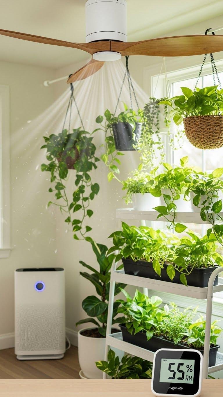 Move plants for cross-ventilation, trim dense foliage, and set low-speed ceiling fans to circulate air without drying roots. Use air purifiers to reduce airborne spores and monitor humidity with a hygrometer.
