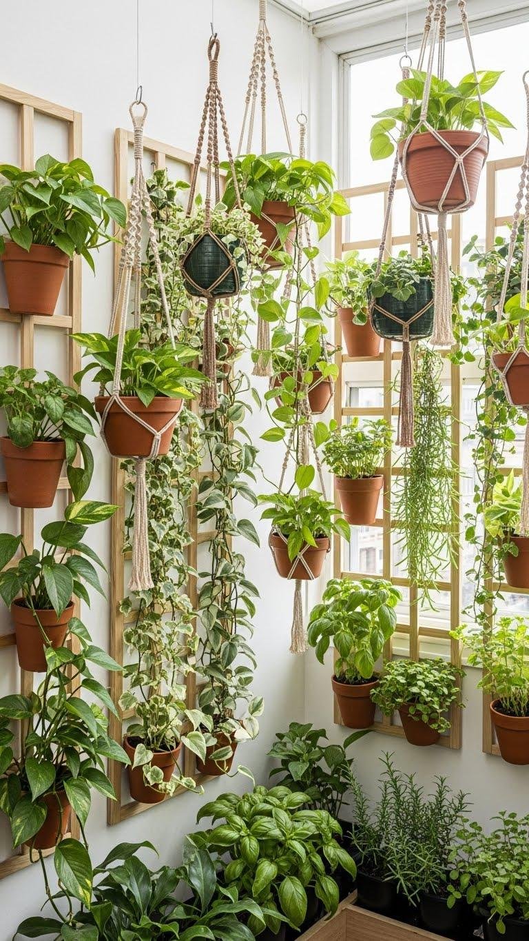 Mount hanging planters for vines and herbs, keeping light exposure and soil moisture manageable.