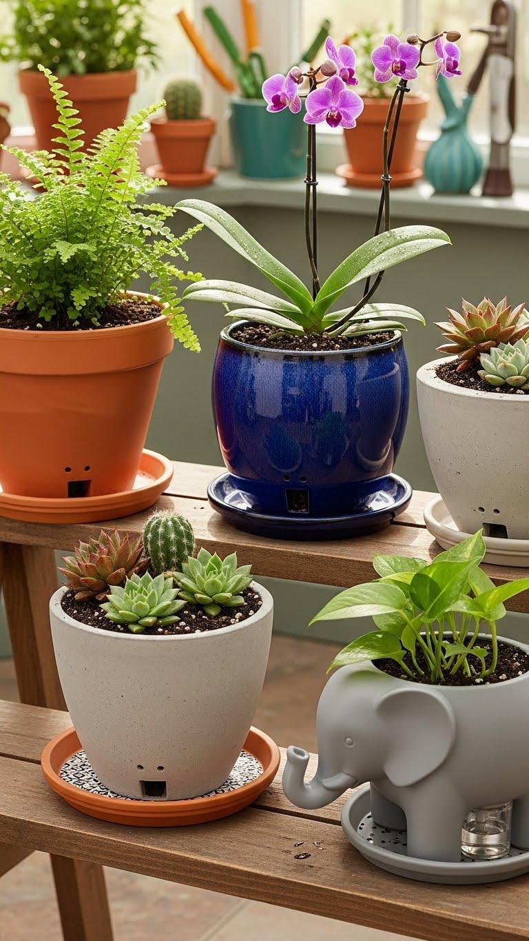 You’ll prevent rot, control moisture, and keep plants thriving. Use self watering inserts or trays above decorative saucers to catch runoff without sealing the pot.