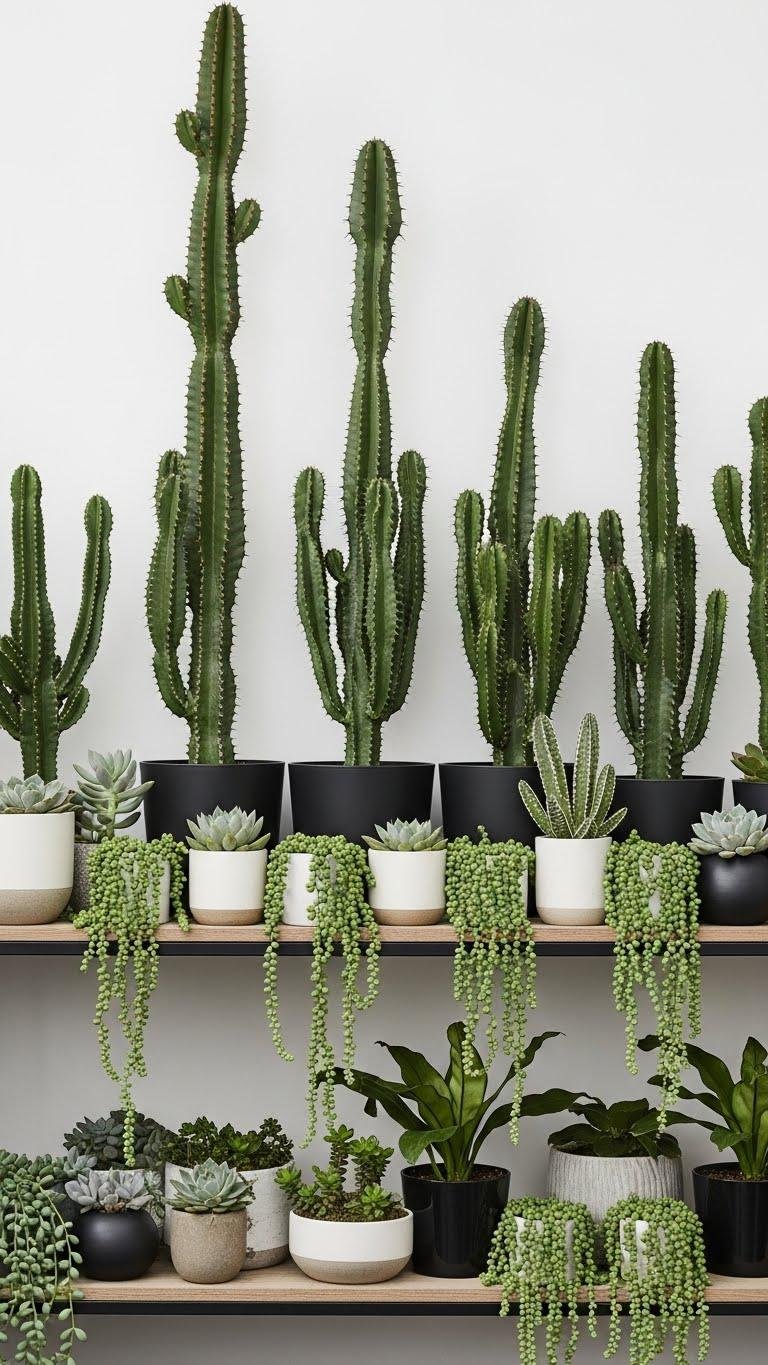 Tall columnar succulents give your shelf a sculptural backbone, anchoring low pots and trailing vines with vertical interest.